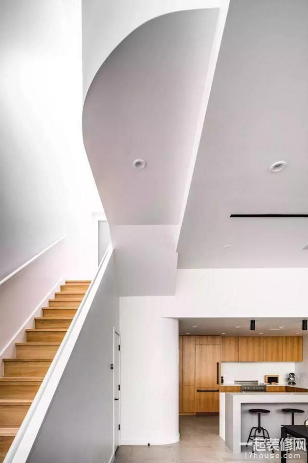 通往二楼的楼梯下方也被利用起来做了步入式的储物间,上方走廊改成了创意的弧线造型,木质踏步和白色的护栏结合起来,让人感觉清新而又自然。